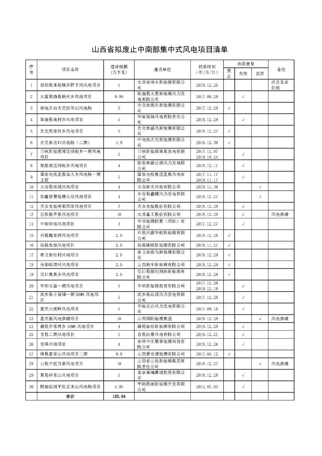 | 山西省擬再廢止30個風電項目!總計規(guī)模153.04萬千瓦 |
