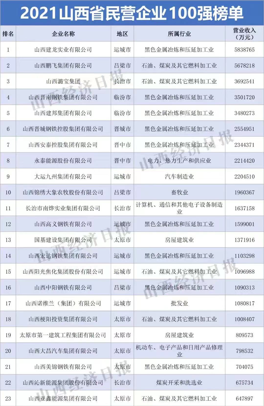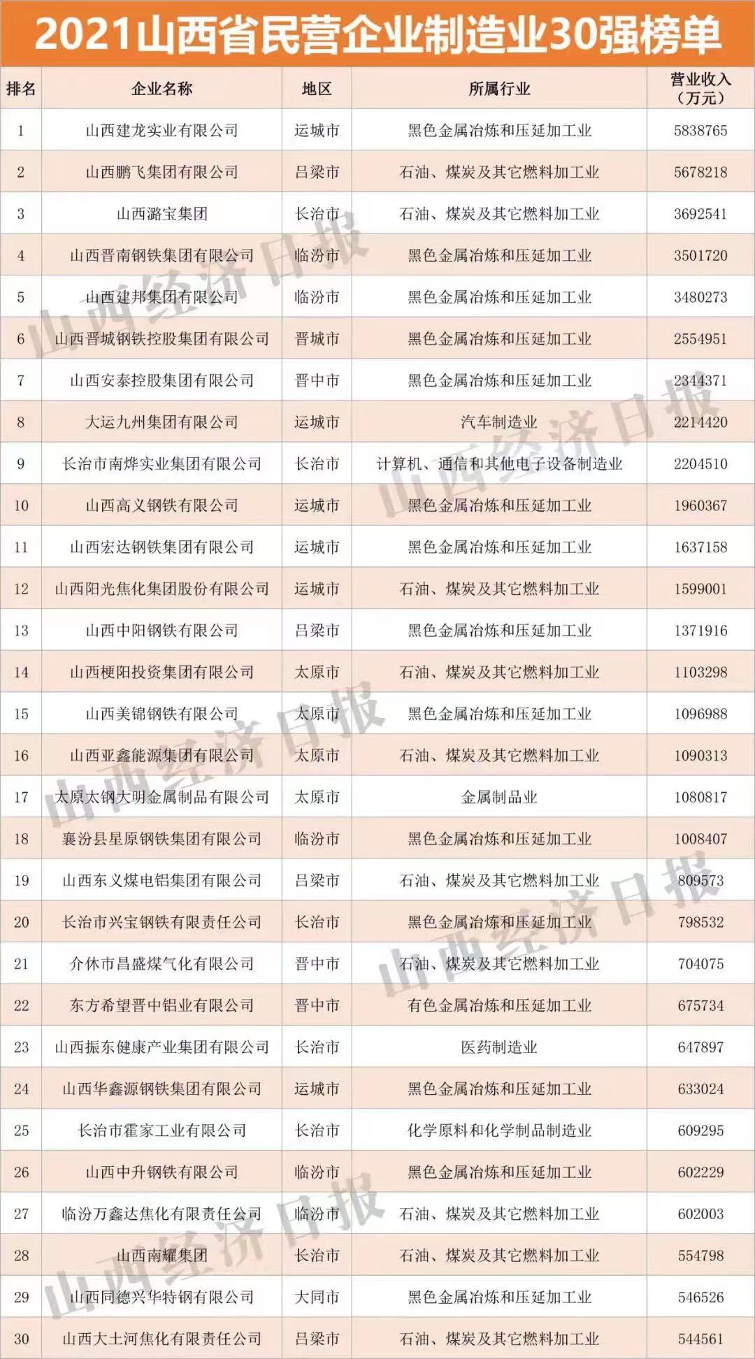 10月15日,由山西省工商聯(lián)主辦,省工信廳、省財政廳、省市場監(jiān)管局等支持的“2021山西省民營企業(yè)100強(qiáng)發(fā)布會”在太原舉行。會議發(fā)布“2021山西省民營企業(yè)100強(qiáng)”、“2021山西省民營企業(yè)制造業(yè)30強(qiáng)”、“2021山西省民營企業(yè)服務(wù)業(yè)20強(qiáng)”、“2021山西省最具潛力民營企業(yè)”系列榜單及《2021山西民營企業(yè)100強(qiáng)調(diào)研分析報告》。首次發(fā)布“2021山西省民營準(zhǔn)獨(dú)角獸企業(yè)”、“2021山西省民營瞪羚企業(yè)”榜單。