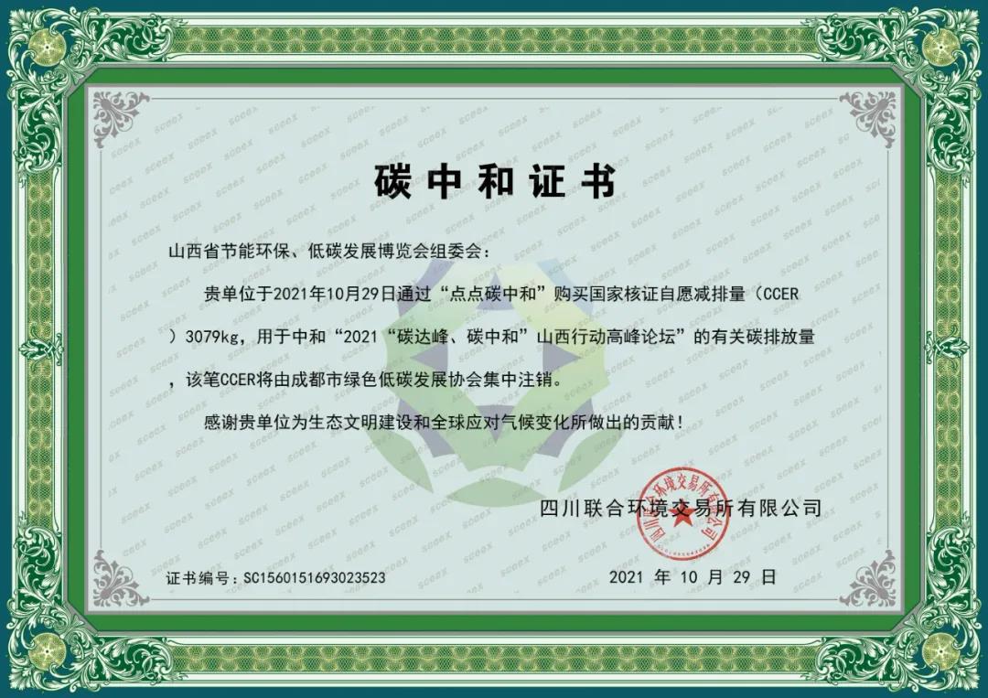 祥睿能源作為會議協(xié)辦單位,結合會議“低碳創(chuàng)新·綠色發(fā)展”的主題,聯(lián)合主辦方打造成了名副其實的山西首次碳中和博覽會,即將本次會議執(zhí)行過程中產生的二氧化碳排放量,通過購買 CCER實現(xiàn)了碳減排的抵消。同時,在現(xiàn)場授予了大會組委會《碳中和證書》,由省節(jié)能協(xié)會會長藺建國代表組委會領取了該項證書。
