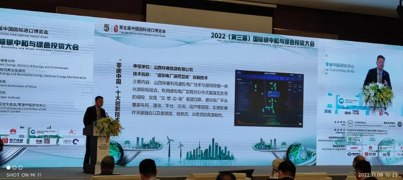 11月8日,在上海舉行的第五屆中國(guó)國(guó)際進(jìn)口博覽會(huì)上,2022(第三屆)國(guó)際碳中和與綠色投資大會(huì)暨零碳中國(guó)城市峰會(huì)隆重舉辦,“零碳中國(guó)”成果重磅發(fā)布,祥睿能源的“虛擬電廠源荷互動(dòng)技術(shù)” 榮登“2022年度‘零碳中國(guó)’十大創(chuàng)新技術(shù)”榜,總工程師孫大偉出席大會(huì)并發(fā)表《虛擬電廠與零碳交通》的演講。