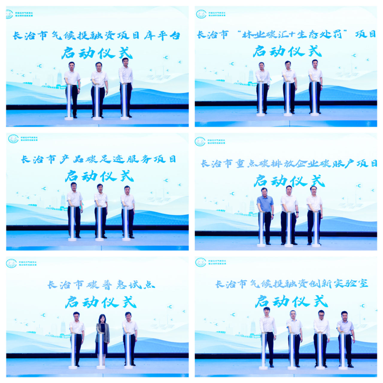 在長(zhǎng)治市氣候投融資項(xiàng)目啟動(dòng)儀式上,長(zhǎng)治市氣候投融資項(xiàng)目庫(kù)平臺(tái)、長(zhǎng)治市“林業(yè)碳匯+生態(tài)處罰”項(xiàng)目、長(zhǎng)治市產(chǎn)品碳足跡服務(wù)項(xiàng)目、長(zhǎng)治市重點(diǎn)碳排放企業(yè)碳賬戶項(xiàng)目、長(zhǎng)治市碳普惠試點(diǎn)、長(zhǎng)治市氣候投融資創(chuàng)新實(shí)驗(yàn)室6個(gè)項(xiàng)目正式啟動(dòng);