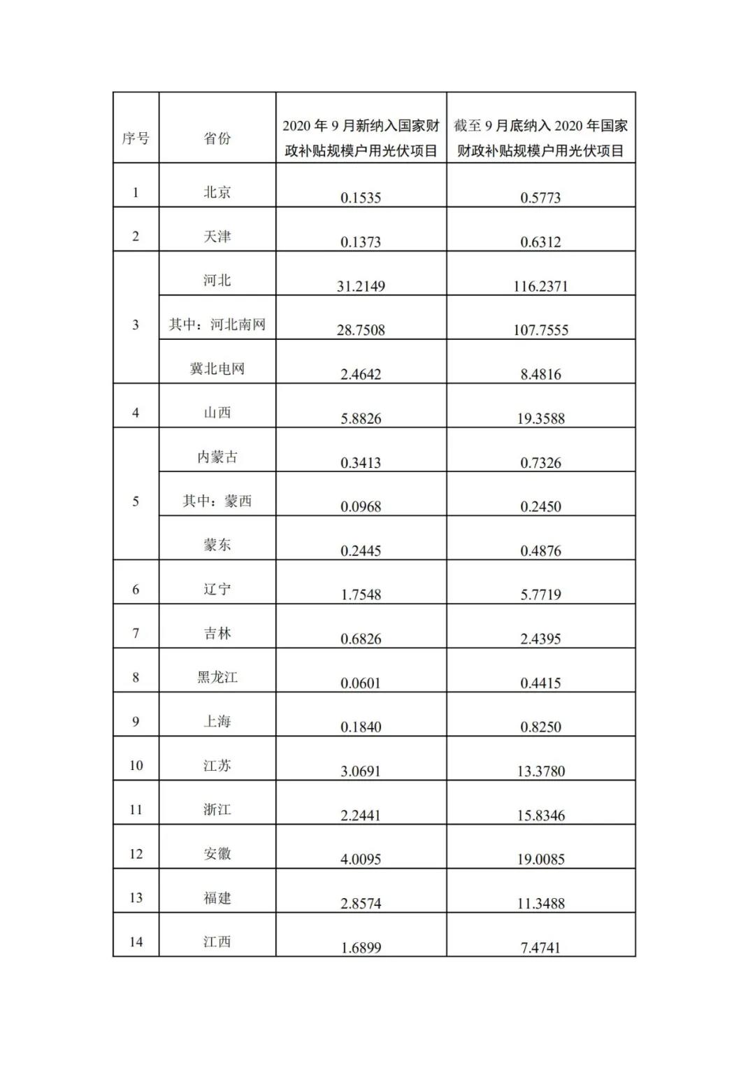 按照《國家能源局關(guān)于2020年風(fēng)電、光伏發(fā)電項(xiàng)目建設(shè)有關(guān)事項(xiàng)的通知》(國能發(fā)新能〔2020〕17號)和《國家能源局綜合司關(guān)于2019年戶用光伏項(xiàng)目信息公布和報(bào)送有關(guān)事項(xiàng)的通知》(國能綜通新能〔2019〕45號)關(guān)于戶用光伏項(xiàng)目管理有關(guān)要求,全國共有30個(gè)省份報(bào)送了戶用光伏項(xiàng)目信息(西藏?zé)o納入2020年財(cái)政補(bǔ)貼規(guī)模戶用光伏項(xiàng)目,未報(bào)送)。 根據(jù)各省級能源主管部門、電網(wǎng)企業(yè)報(bào)送信息,經(jīng)國家可再生能源信息管理中心梳理統(tǒng)計(jì),2020年9月新納入國家財(cái)政補(bǔ)貼規(guī)模戶用光伏項(xiàng)目總裝機(jī)容量為130.1萬千瓦。截至2020年9月底,全國累計(jì)納入2020年國家財(cái)政補(bǔ)貼規(guī)模戶用光伏項(xiàng)目裝機(jī)容量為527.4萬千瓦。詳細(xì)情況見附表。 附表:納入2020年國家財(cái)政補(bǔ)貼規(guī)模戶用光伏項(xiàng)目裝機(jī) 容量統(tǒng)計(jì)表(截至2020年9月30日) 附表 納入2020年國家財(cái)政補(bǔ)貼規(guī)模戶用光伏項(xiàng)目 裝機(jī)容量統(tǒng)計(jì)表 (截至2020年9月30日)
