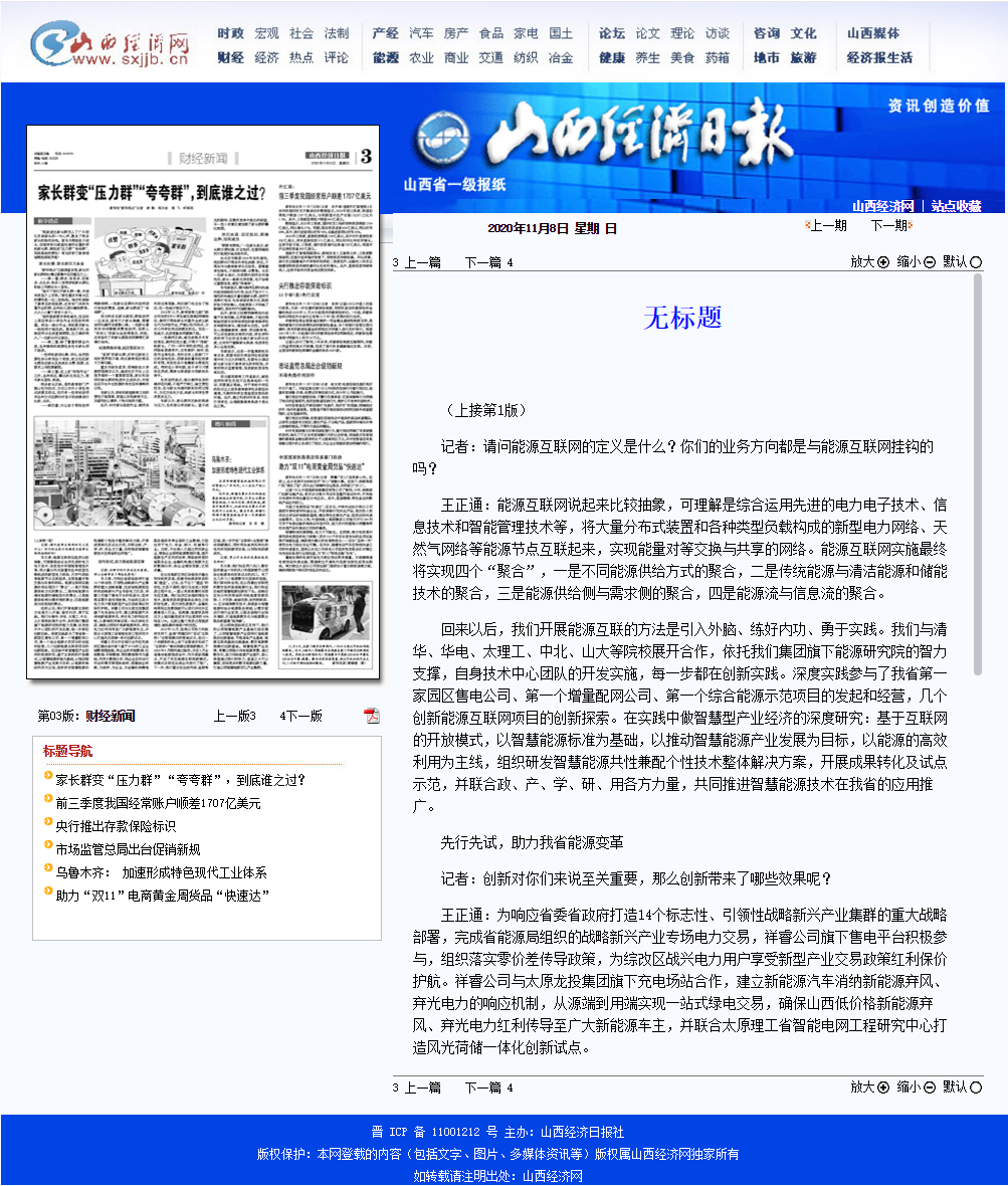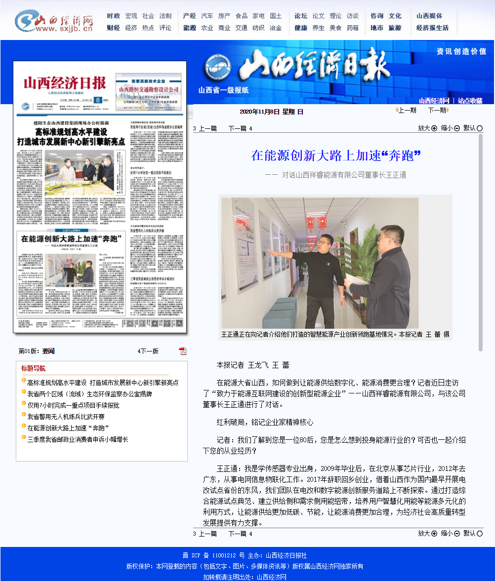 2020年11月8日《山西經(jīng)濟(jì)日?qǐng)?bào)》晉周刊專欄,就祥睿能源董事長(zhǎng)王正通與記者的對(duì)話進(jìn)行了專題報(bào)道,淺談如何弘揚(yáng)企業(yè)家精神。 企業(yè)家是企業(yè)的統(tǒng)帥和靈魂,也是改革創(chuàng)新的重要力量。習(xí)近平總書記指出:“我們?nèi)嫔罨母?,就要激發(fā)市場(chǎng)蘊(yùn)藏的活力。市場(chǎng)活力來(lái)自于人,特別是來(lái)自于企業(yè)家,來(lái)自于企業(yè)家精神。”作為企業(yè)家,要運(yùn)用創(chuàng)新意識(shí)和創(chuàng)新能力,能注意到別人忽略的問(wèn)題,想到他人沒有想或不敢想的問(wèn)題,抓住時(shí)機(jī),出奇制勝。無(wú)論是管理創(chuàng)新、產(chǎn)品創(chuàng)新、服務(wù)創(chuàng)新還是技術(shù)創(chuàng)新,本身就充滿著市場(chǎng)和技術(shù)的不確定性,需要企業(yè)家有膽識(shí)、有魄力,敢于擔(dān)當(dāng)。面對(duì)經(jīng)濟(jì)發(fā)展新常態(tài),更需要發(fā)揚(yáng)企業(yè)家精神,以更大的決心、更大的勇氣參與市場(chǎng)競(jìng)爭(zhēng),引領(lǐng)企業(yè)激發(fā)創(chuàng)新改革活力。