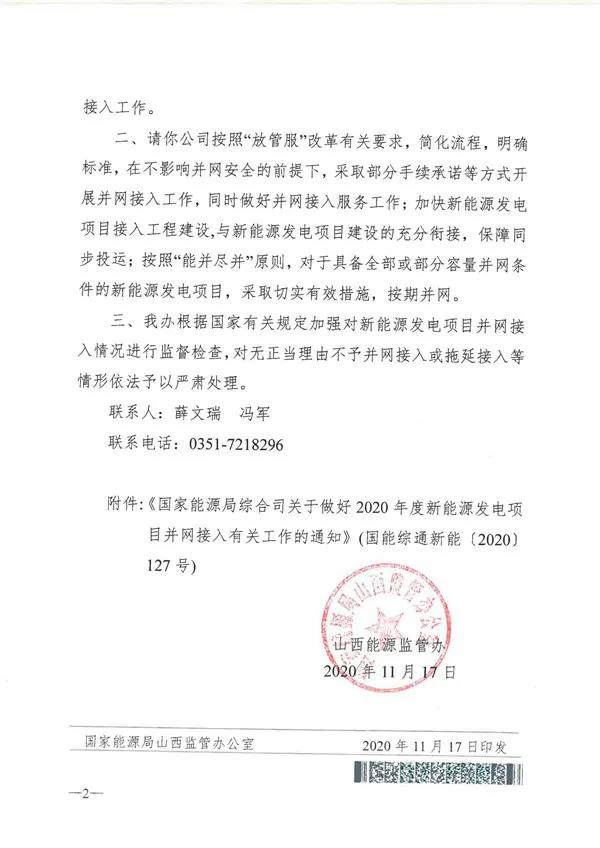 11月19日,山西能源監(jiān)管辦印發(fā)《山西能源監(jiān)管辦關(guān)于做好2020年度新能源發(fā)電項(xiàng)目并網(wǎng)接入有關(guān)工作的通知》,要求電網(wǎng)企業(yè)簡(jiǎn)化工作流程,明確接入標(biāo)準(zhǔn),按照“能并盡并”原則,對(duì)于具備全部或部分容量并網(wǎng)條件的新能源發(fā)電項(xiàng)目,采取切實(shí)有效措施,全力統(tǒng)籌做好新能源發(fā)電項(xiàng)目并網(wǎng)接入工作,確保按期并網(wǎng)。 下一步,山西能源監(jiān)管辦將進(jìn)一步加強(qiáng)新能源發(fā)電項(xiàng)目并網(wǎng)接入情況進(jìn)行監(jiān)督檢查,對(duì)無(wú)正當(dāng)理由不予并網(wǎng)接入或拖延接入等情形依法予以嚴(yán)肅處理。 文件全文如下: |