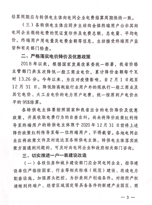 山西省發(fā)改委、住建廳、市場監(jiān)管局聯(lián)合印發(fā)通知,決定進一步清理規(guī)范轉(zhuǎn)供電環(huán)節(jié)收費行為,減輕企業(yè)負擔。2018年以來,根據(jù)國家發(fā)改委統(tǒng)一部署,山西省價格主管部門共五次降低一般工商業(yè)電價,累計降價金額每千瓦時13.26分。今年以來,為應對疫情影響,自2月1日起至12月31日,山西省降低除高耗能行業(yè)用戶外的現(xiàn)執(zhí)行一般工商業(yè)及其他電價、大工業(yè)電價的電力用戶電費,統(tǒng)一按原到戶電價水平的95%結(jié)算。 通知要求,各轉(zhuǎn)供電主體要嚴格按照國家和山西省出臺的電價降價及優(yōu)惠政策,開展收取電費行為的自查自糾。尚未將降價政策紅利傳導至終端用戶的,限于2020年12月31日前將降價政策紅利傳導至每一位終端用戶,不得截留。詳情如下: